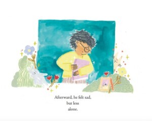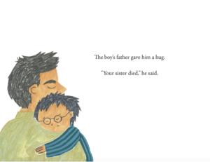 Another interesting moment in the book comes in the page after the death of the boy’s sister, when he goes to school the following fall. This is when the book’s illustrator, Kateri Kramer, chose to put a hint of a smile on the boy’s face as he reads from a book.