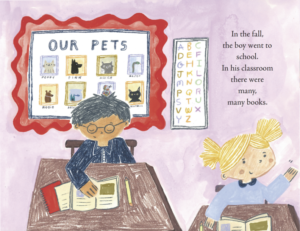 There’s no way I would have done that if I had illustrated the book. I would have depicted the boy as overwhelmingly sad, sitting in the corner, reading quietly. That’s how I remember myself. (And there was nothing in the text—“In the fall, the boy went to school. In his classroom there were many, many books”—to suggest the presence of that shy little smile to Kateri.) But here again, “fiction” is truer than fact. Truth be told, I was happy when reading, even months after my sister’s death—and it was an intensely personal, secret happiness. And that’s what that hint of a smile conveys—an inward, barely detectable joy in the act of reading. How did Kateri know to depict me as I really was, rather than how I remember I was?