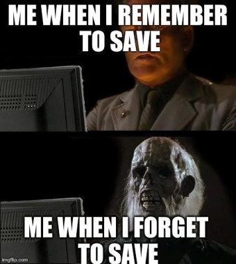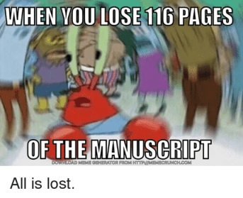 3. Save OFTEN! Make it a HABIT! I used to live in a place with frequent blackouts and brownouts, and I had to learn to save after every single paragraph. Of course, those were in my desktop computer days. These days I use a tablet, but that doesn’t mean accidents can’t happen. Computers and wordprocessors freeze, crash, and randomly reboot without warning sometimes, and for the love of God, never trust the autosave. If saving after every paragraph is a bit too excessive for you, at least consider saving after every page or every couple pages.