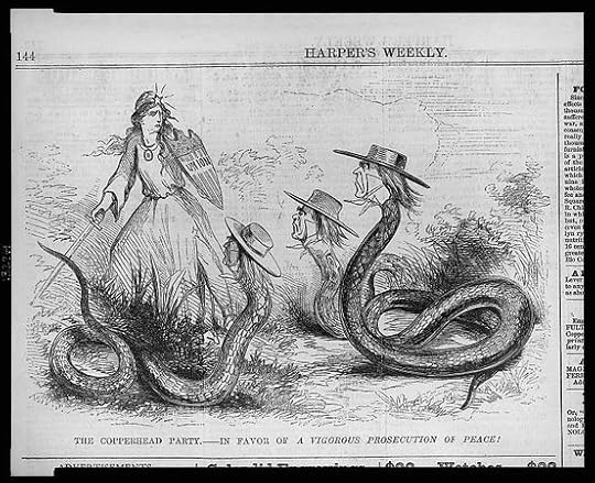 In the opening chapter of my novel Lucifer's Drum (which I hope to post here presently), the hack newspaper publisher Gideon Van Gilder meets an especially unpleasant end. Van Gilder is a Copperhead, or "Peace Democrat"—one of that loud Northern political faction opposed to Lincoln, the Draft and Emancipation. Most Copperheads favored preservation of the Union but proclaimed the right of the Southern and border states to maintain slavery. And they opposed black advancement on principle, whether free or slave, portraying the white majority as besieged by evil forces. They identified as Democrats and strongly influenced the direction of that party, whose 1864 presidential platform was wholly Copperhead. Still, it has to be stated that many thousands of non-Copperhead Democrats ("War Democrats") fought in the federal ranks.