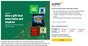 They will get monthly credits for purchasing any audiobook for each month of the gifted subscription. A single credit allows you to purchase any book in the main Audible library, from bestsellers to new releases, even if they cost much more in cash.They get the Plus Catalog and all-you-can-listen catalog that includes thousands of audiobooks, podcasts, and originalsThey keep any books bought with credits even after the gift period ends.And what I like best…the gift membership doesn’t automatically renew, so they won’t be charged after the subscription ends.How to Gift an Audible SubscriptionHere is a step-by-step guide to giving them an Audible subscription: