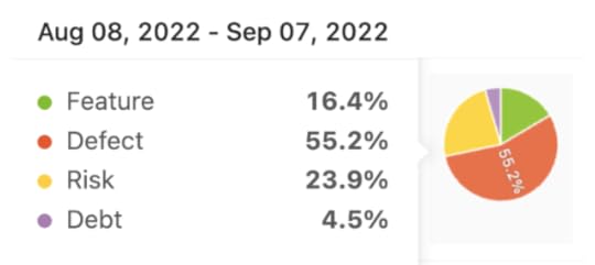 In 2018 Mik Kersten prescribed four work item types to use in software delivery: Features, Defects, Risks, and Debt. These are used by many companies measuring flow. The benefit of categorizing work this way is that it allows for rapid understanding of demand (work type demand) with a single glance. It’s also an easy way to allocate capacity and see ratio per work item type.