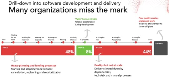End-to-end Flow timeWe call this water-scrum-fall, where development teams typically have relatively fast flow, but the overall time-to-market washes out that success. The time spent on actual development is often between 2-12% of the total time-to-market. More than half the time is spent in heavy planning & funding processes. And beyond a few instances where DevOps has worked, for most applications, releases are slowed down by cross-product dependencies, brittle legacy systems and high ceremony processes.