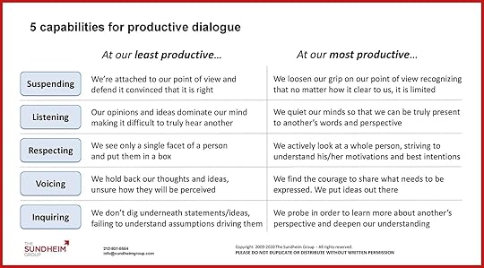At the heart of good dialogue is the ability to put your perspective aside to truly hear others. This capability is called suspending. It, along with four additional capabilities — listening, respecting, voicing, and inquiring — make up what I refer to as the five fundamental moves of dialogue. Each can be viewed on a continuum from least productive to most productive. Below is a slide capturing these continua. (If the image is hard to read, identical text is below it.) Effective dialogue is the result of a group of people moving to the more productive side of the continuum on each dimension.