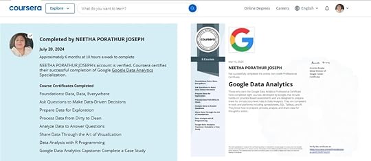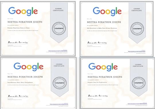 Kudos to Coursera! Even an unsystematic person like me could be transformed into an analytical and skilled individual with Coursera’s dynamic instructors’ self-paced video tutorial which breathed their expertise in the subjects they are passionate about, the insightful readings, the quizzes, a variety of activities including hands-on activities, and the final assessments, is nothing short of a miracle. Call it the psychology of motivation or the ‘Pygmalion effect’! One success with a 90+ score have led me to another, influencing me to put in the required effort to taste similar feats. Before I realised it, I have completed all the eight courses and have become a data analyst with increased problem solving, decision making, and research skills.