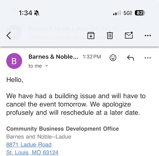 Sorry for the inconvenience, everyone, but I have been informed that there is an issue with the building at Barnes & Noble Ladue, so the event for today has been cancelled. Hopefully, we’ll be able to reschedule soon.