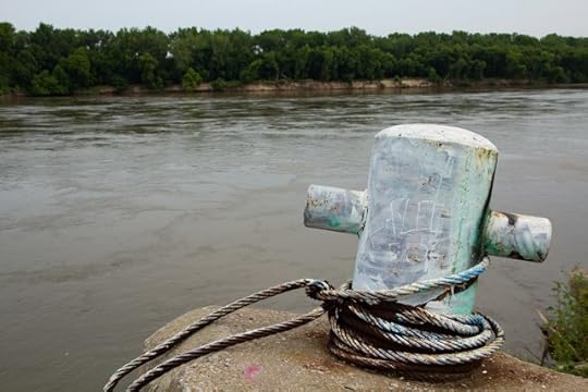 I think the picture below (looking west, toward the confluence of the Kaw/Kansas and Missouri Rivers) shows shorelines, but they have been constructed by humans. Or does it show mere edges? I guess I’ve always assumed shorelines were natural.