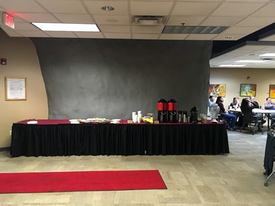 Here’s a very wide view of what the breakfast table looked like after the food had been set out. Plates and napkins flank the platters containing (yummy) pastries. Hot cups and lids are stacked to the left of the coffeepots, and clear cold cups are set out to the left of the water dispenser on the right side of the table.