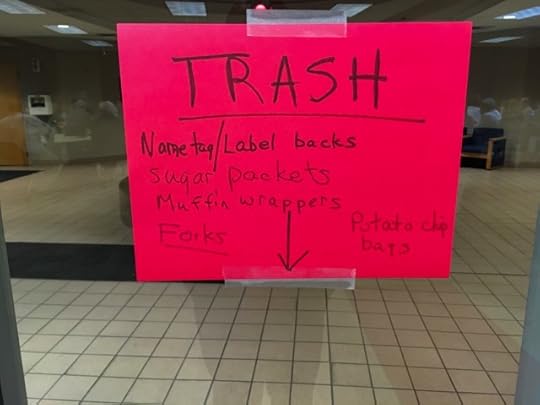 Before the conference started, we set up a makeshift “materials processing” area by the door. We chose the trash can with a plastic bag for the compostables, because the food waste, including coffee cups, would mess up the carpet beneath the blue recycling bin (which has holes in the bottom).
