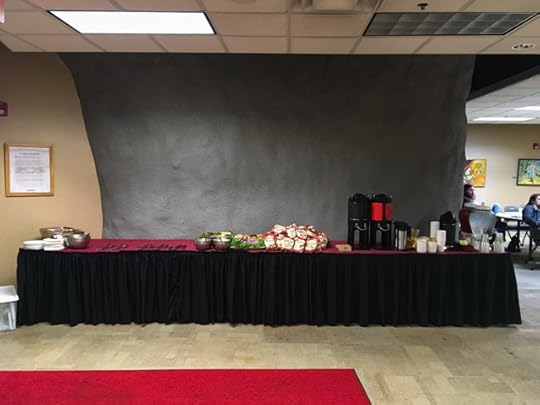 Lunch was more complicated, since it included salad, sandwiches that still needed condiments, and potato chips. On the far left below, the plates and napkins we provided can be seen in front of metal bowls of salad and dressing. Moving right in the picture, the staff laid out metal tongs for picking up the sandwiches that would shortly be arriving, as well as metal bowls of mayo and other condiments; a platter with lettuce, onion, tomatoes, and pickles; and bags of potato chips. To make room for all that, we moved the hot cups to the other side of the coffee dispensers.