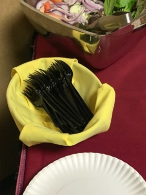 At the beginning of this post, I said I was fortunate to be encouraged to make this a zero waste event. I’m grateful to Robbie for being so receptive to the idea and working with catering to make it happen. Usually, the response to a request to reduce waste at an event is something like, “Well…” And with good reason. Because American society is accustomed to using disposable plates, cups, and flatware at events, any movement toward zero waste seems like a pain in the neck. For zero waste to work on a large scale, to the point at which it is convenient, companies and schools must incorporate into their goals and planning from the beginning.