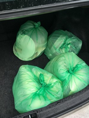 And here are the compostables from the conference, all collected in biodegradable bags and ready to go to the Missouri Organics compost bin at a business I patronize. (Yes, I did get permission before I dropped off those four bags. And no, individuals can’t just show up at Missouri Organics with compostable plates. MO picks up from businesses and organizations only. But individuals can take compostables to Urbavore Urban Farm.)