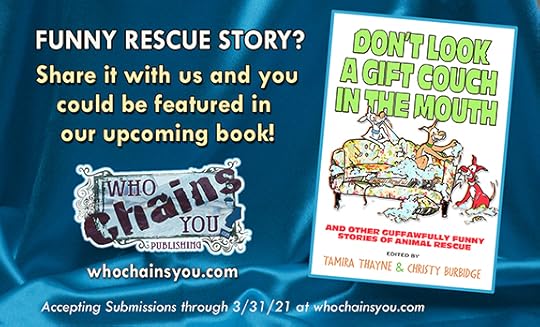 Have a laugh out loud story about something that happened in animal rescue? Share it with us, and we’ll choose 15-30 stories for our upcoming 2021 book entitled Don’t Look a Gift Couch in the Mouth—And Other Guffawfully Funny Stories of Animal Rescue. We’re seeking essays of 1000-3000 words, and would love a photo or two of the animal in question to go with your tale if possible.