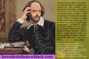 The future was oddly more like I imagined than I imagined it would be. But clearly, one thing never changes: reviewers are forever! And since everybody hates a critic, I am not going to find fault in your lovely book, (which I must study anon and anon, as it is written in such a strange language.) Instead I shall point to Sonnet 65, in which you will find references to gaol, (gates of steel) memoir, (time’s chest, meditation) and ink (writing) that produces beauty. Conclude what you may. from this. — William Shakespeare