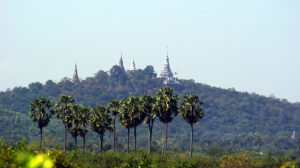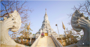 Oudong Temple at the top of the mountain displaying the four stupas. The largest on the right is the one the Golden Urn is kept in.