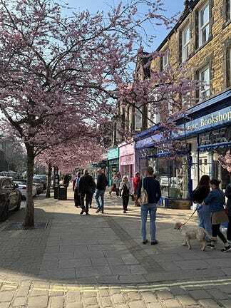 Anyway, here we are at the last weekend in March regardless. Ilkley is looking lovely with all the blossom out on its main boulevard (although don’t let the blue sky fool you – we had snow flurries here yesterday!) And this picture features my local independent bookshop which is interesting because . . . (and it’s almost as if I think about this)