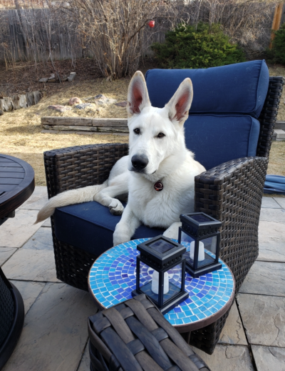 • The latest pics of The Granddog making himself at home on the furniture. (Those elegant ears! That aristocratic snout!) Navarre is a white German Shepherd, a mere puppy of 6 ½ months and 75 lbs. Someday when this is all over, Glen and I hope to meet him in person.