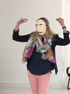 “Now go to the table and choose the mask that best matches your inner voice. Look at the expression. Adopt the expression on your own face, then maintain it as you put on the mask. Feel your way into this persona that lives with you day to day.”
