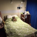 I’m glad really they’re not ready – it gives me something to do. My way of coping in a crisis is to make a list and take action. If I don’t do that, I just sit and worry and that’s no use to anyone. First stop was to make her comfortable in her little cubicle. Fortunately she was beside a window – anything else would have been unthinkable in this fresh air family. Then it was the pillow – I never go anywhere without my pillow! And a nice