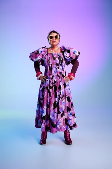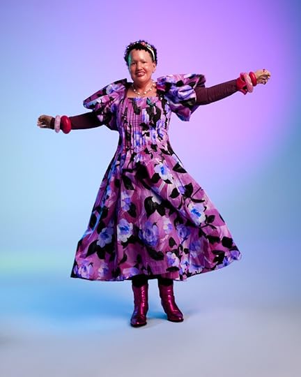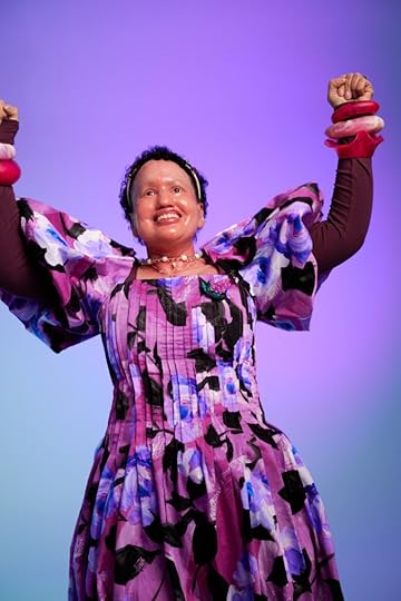 Gallery: three still photos of Carly, a woman with red skin and short dark curly hair, wearing a purple floral dress with big sleeves, hot pink boots, a stack of necklaces, jewelled headband and big bangles and rings. Each pose is defiant and joyous. The background is purple and teal.