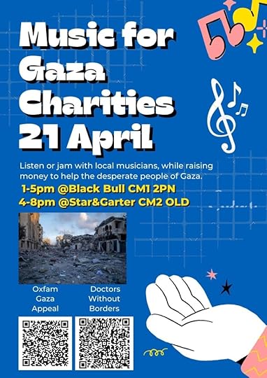 I am organising a gig and jam to raise some money for the Oxfam Gaza appeal and for Doctors Without Borders work in Palestine. It isn’t much, but I feel like I should do something. You don’t need to come to the gig to donate, though it would be great if you do. The link to the JustGiving page is below