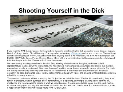 Sup Based Fobs... It's been a minute since I wrote on this blog but we back. I gave this talk in Melbourne at #Carbon13 yesterday. I'm not an expert on the economy. I'm just a dude that reads the NYT, watches Rachel Maddow, Alex Wagner, reads Franco Berardi, and fux with Jon Stewart. This is all shit that's readily available and full of knowledge darts. But watching the news the last year, I started getting the same exact feeling I had in law school all over again. It's useless to complain about our representatives or put my hope into some dudes who are too pussy to resist lobbyists, private interests, and the machine. We don't enact laws that need to be enacted because of private interests and filibusters. Then when we do enact half-assed laws with blunt instruments, those laws aren't equally administered. There are even fools trying to rig the NYC Mayoral election over meatballs in the Bronx.