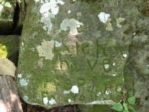 The trail was marked with ribbons that had been placed a year earlier. The first ribbon had fallen from where it was tied and was lying on the ground. And the second ribbon wasn’t much easier to find. The trail was pretty overgrown. What thought would be a 15-minute hike quickly turned into a half hour. Right when I was about to turn around, I noticed that the landscape had changed and there was a hill covered in boulders to my right. I figured the Wetzel Rock was likely to be there, so I started walking around the base of the hill. Sure enough, the rock was there. I almost walked right past it, then I noticed the writing on it.