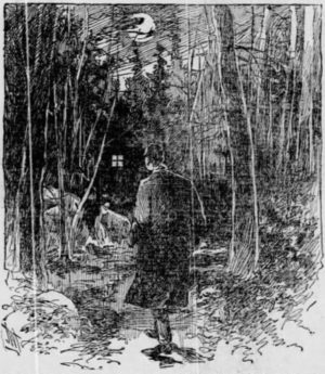 I was frightened, and my heart beat fast, but I am not a man to run. After hesitating for a few moments, I turned into the wood in the direction of the window and the light and found a path there, which I began to follow cautiously. I walked to the place where I had first heard the bell and seen the window and the light, but the window and the light were as far away now as when I started from the road. As I watched, I could see it move, but I could hear nothing. I stopped again. The window and light seemed to stop. Should I run? No, I would shout. So I cried out, “hullo!”