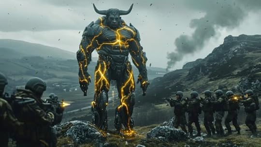 Drawing from my love of classic cinema and mythological creatures, a terrifying entity emerges from the monolith—a grotesque figure reminiscent of a minotaur, bringing ancient fears into modern England. This addition to the tale not only serves to heighten the sense of dread but also bridges our narrative to the mysteries of ancient civilizations, suggesting that what we understand of our past is merely the surface.