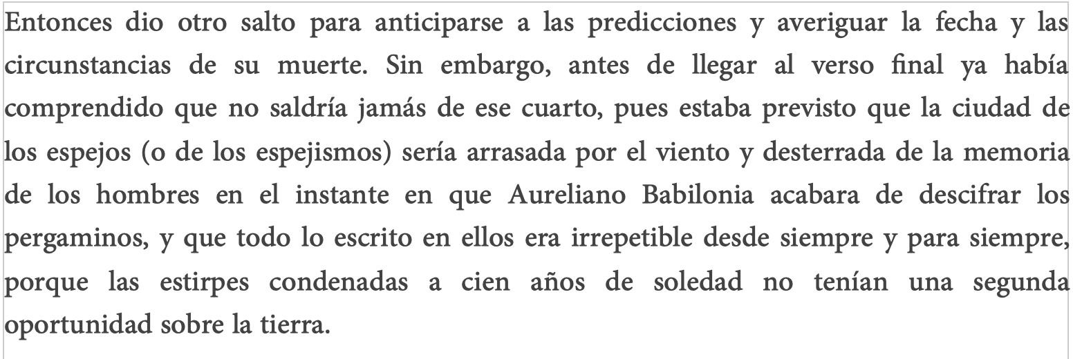 13.- Intenté que el final de La libertad de un gorrión se pareciera -pero conservando las distancias, obviamente- al de Cien años de soledad de Gabriel García Márquez, que es este que podéis leer aquí: