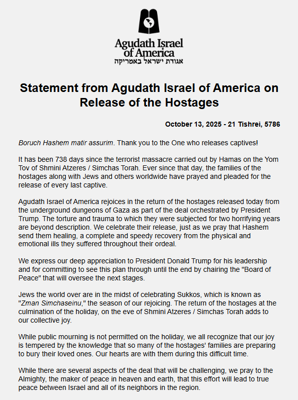 I might have (thankfully) been wrong about how Hamas would not release all the hostages, but I was right about the charedim refusing to give credit to the IDF for this incredible result. But I was right for the wrong reasons. Here’s the statement that Agudas Yisrael just put out: