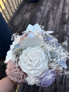 In real life, I have a friend who designs these arrangements. Her name is Christy Hart, and she’s the owner and creative force behind Bloomphoria. She takes flowers made from thin pieces of balsa wood, dyes them, and then arranges them. She makes arrangements of all sizes. I have one in my office, one on my piano, and my daughter’s prom corsage was also made by Christy. I wish I’d had something like these flowers for my own wedding!