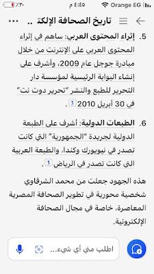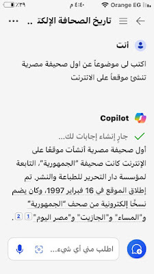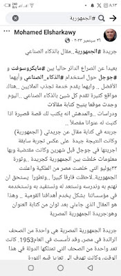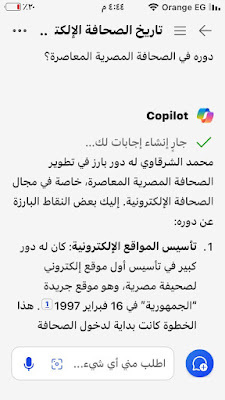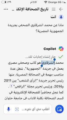 هذا حوار أجريته بالذكاء الإصطناعي من خلال تطبيق مايكروسوفت (#كوبايلوت)المدمج معمستعرض (إيدج)و محرك البحث(بينج)وهو كما تقول عنه مايكروسوفت مساعد شخصي ثوري للدردشة بالذكاء الإصطناعي ويمكن تنزيله مجانا من ( آبي ستور) بالنسبة لأجهزة الآيفونعندما تبدأ تشغيله تظهر كلمة ترحيبية باسمك ويسألك:اسألني أي سؤال كنت قبل عدة شهور قد جربت أن أخوض التجربة مع ( جي بي تي) ولاحظت وجود بعض اخطاء ..وقد لاحظت يومها ان لديه بعض التشويش في المعلومات وتداخل بعض المعلومات عن الشخصيات المتشابهة وكتبت ذلك في وقته..الآن تطورت تطبيقات الذكاء الاصطناعي بشكل مذهل ووجدت (كوبايلوت مايكروسوفت )يسألني السؤال المعتاد فقررت أن أجرب وكانت النتيجة ممتازة سألته واجابني وكانت هذه حصيلة حوار ممتع.ومحرك بحث بينج يصدر نص الحوار بقوله:إليك الإجابة التي حصلت عليها باستخدام Microsoft Copilot، أول محرك إجابات يعمل بالذكاء الاصطناعي في العالم. اختر لرؤية الإجابة الكاملة أو جربها بنفسك. https://sl.bing.net/fS4SXU0n5hs #الجمهورية كان سؤالي الأول:اكتب لى موضوعاً عن أول صحيفة مصرية تنشئ موقعاًعلى الانترنت #Copilot:أول #صحيفة مصرية أنشأت موقعًا على #الإنترنت كانت صحيفة “الجمهورية”، التابعة لمؤسسة دار التحرير للطباعة والنشر. تم إطلاق الموقع في 16 فبراير 1997، وكان يضم نسخًا إلكترونية من صحف “الجمهورية” و"المساء" تلتها صحيفة “الشعب” التي أصدرت أول نسخها الإلكترونية في 1 أكتوبر 1997، ثم صحيفة #الأهرام” التي أطلقت موقعها الإلكتروني لجريدة “الأهرام ويكلي” الصادرة باللغة الإنجليزية في منتصف يونيو 1998، وأخيرًا النسخة الإلكترونية لجريدة “الأهرام” الصباحية التي بدأت في 5 أغسطس 199812.كانت هذه الخطوات الأولى نحو دخول الصحافة المصرية عصر الصحافة الإلكترونية، حيث بدأت الصحف المصرية في تحديث أنظمتها واستخدام تقنيات متطورة مثل النص الفائق والوسائط المتعددة في بعض الموضوعات#sharkwy11ثم سألني : هل لديك أي استفسارات أخرى حول تاريخ الصحافة الإلكترونية في مصر؟قلت:ماذا عن محمد الشرقاوي الصحفي بجريدة الجمهورية؟محمد الشرقاوي هو كاتب وصحفي مصري يعمل في جريدة “الجمهورية”. شغل عدة مناصب مهمة في الصحافة المصرية، منها رئيس تحرير جريدة “الرأي للشعب” بين 2011 و2014، ورئيس تحرير مجلة "الرافعي". كما عمل محاضراً للصحافة الإلكترونية في قسم الصحافة بكلية الآداب في جامعة حلوان بين 2007 و2010، وكان مشرفاً على مركز تكنولوجيا المعلومات في مؤسسة دار التحرير للطبع والنشرالشرقاوي كان له دور بارز في تطوير الصحافة الإلكترونية في مصر، حيث أشرف على الطبعة الدولية لجريدة “الجمهورية” التي كانت تصدر في نيويورك وكندا، والطبعة العربية التي كانت تصدر في الرياض كما حرر صفحة “التحرير نت” في الجريدة، وأصدر أكثر من 20 مؤلفاً في مجالات مختلفة مثل الأدب والصحافة والسياسةبصمة صحفية محمد الشرقاوي له بصمة واضحة في مجال الصحافة الإلكترونية والأدب. من بين مؤلفاته البارزة: 1. “الطريق إلى القمة” - يتناول قصص النجاح والتحديات التي تواجه الأفراد في مسيرتهم المهنية. 2. “دنيا… وإن مالت” - مجموعة من المقالات القصصية. 3. “الأرض مقابل السلام” - يناقش قضايا السلام في الشرق الأوسط. 4. “كتابة بنبض القلب” - يتناول فن الكتابة بأسلوب أدبي. 5. “الحياة على الإنترنت” - دليل لاستخدام الإنترنت في الحياة اليومية. 6. “الشبكة الذكية السريعة” - يتناول تقنيات الشبكات الحديثة. 7. “وراء المتاعب” - يتحدث عن التحديات التي تواجه الصحفيين. 8. “اقتحام الصحافة” - دليل للمبتدئين في مجال الصحافة. 9. “حياة أجمل” - دليل للأسرة لاستخدام الإنترنت. 10. “فن الكتابة في زمن الديجيتال ميديا” - يتناول أساليب الكتابة في العصر الرقمي. 11. “إبداع بلا حدود” - يتحدث عن الإبداع في مختلف المجالات. 12. “الإسلام على الإنترنت للجميع” - يناقش دور الإنترنت في نشر المعرفة الإسلامية. 13. “100 سنة في ذاكرة التاريخ” - يستعرض أحداث القرن العشرين. 14. “يوميات ك