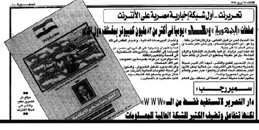 وظهرت يوم 28 إبريل 1998 صفحة بالعدد الإسبوعي للجمهورية عن الشبكة الإخبارية الأولى في في مصر