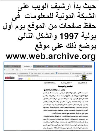 بدأ أرشيف الويب على الشبكة الدولية للمعلومات فى حفظ صفحات من الموقع يوم أول يولية 1997 والشكل التالي يوضع ذلك وهو صورة لمقال د. عواطف عبد الجليل رائدة الصحافة العلمية :