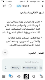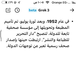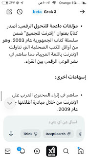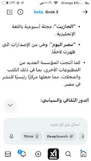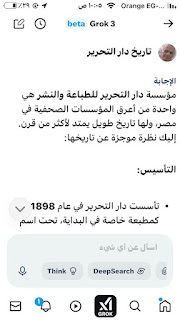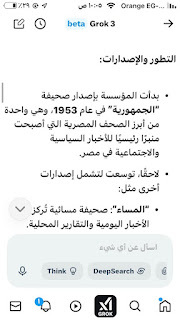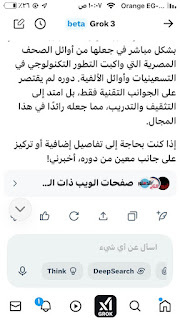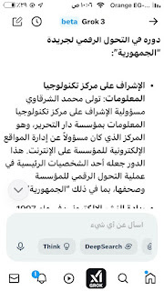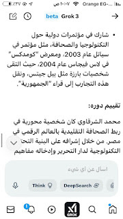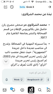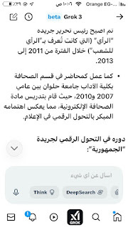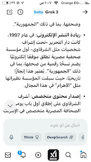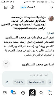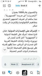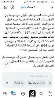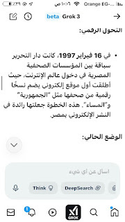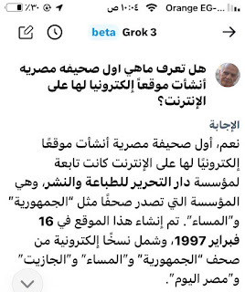 (جروك3 ) برنامج الذكاءالاصطناعي التوليدي .. الأذكى على وجه الأرض كما وصفه إيلون ماسك .. وهو الذي أنتجته شركة xAI معتمدة على قاعدة معلومات منصة إكس (تويتر سابقا) إلى جانب ملياراتالمعلومات على شبكة الإنترنت ..ومعنى كلمة جروك ( التفكير العميق) .. ماسك كان قدأعلن أن جروك يتفوق على كل برامج الذكاء الإصطناعي التي سبقته : تشات (جي بي تي)..و (جيميناي) جوجل.. و(كوبايلوت) مايكروسوفت .. و(ديبسيك) الصيني..وقداستخدمت (جروك3 ) والحقيقة أنه أذهلني بسرعته ودقة معلوماته .. وهاهي أول محاولة معه حيث سألته :هل لديك معلومات عن أول صحيفة مصرية أنشأت موقعها على الإنترنت؟ وكانت هذه إجابته: