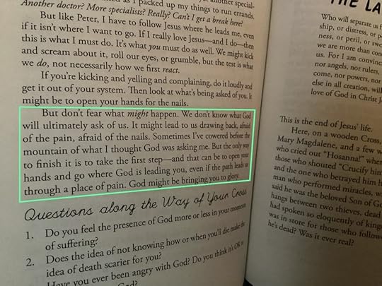“But don’t fear what might happen. We don’t know what God will ultimately ask of us. It might lead to us drawing back, afraid of the pain, afraid of the nails. Sometimes I’ve cowered before the mountain of what I thought God was asking me. But the only way to finish it is to take the first step - and that can be to open your hands and go where God is leading you, even if the path leads us through a place of pain. God might be bringing you to glory.”