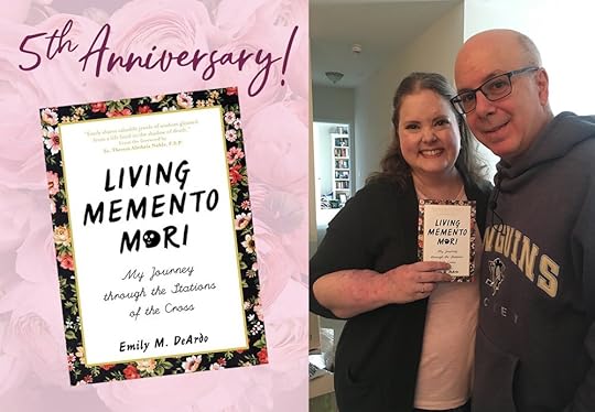 Living Memento Mori 5th Anniversary banner with a picture of Emily and her father when she got her first physical copy of her book.