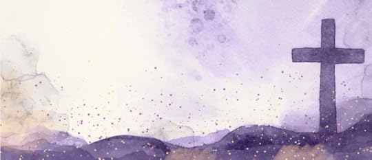 Abstract landscape watercolor banner with splatters of paint and a purple cross.