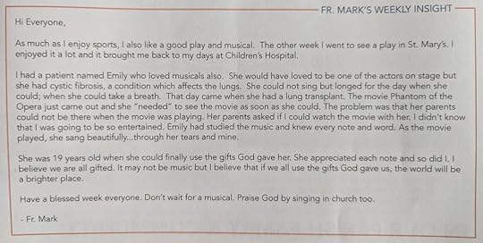 A Memory from Father MarkFrom the July 2025 church bulletin by Father Mark (the Chaplain at Nationwide Children’s Hospital where Emily had her double lung transplant):