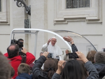 Yesterday I had an amazing time in St. Peter's Square, Vatican City, Rome. Before mass, the Pope drove around the square and came to within 10 meters of where I was sitting. I have asked around a lot and he is very well liked. I thought he was very gentle and softly spoken. As he drove around his Swiss Guard bodyguards hefted babies from the crowd and brought them to him to kiss. The babies were then returned to their ecstatic parents.