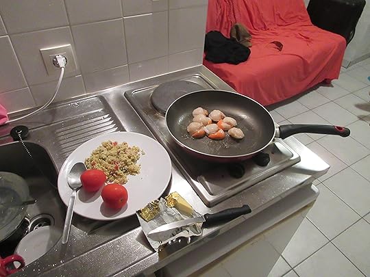 As the title suggests, one of the perks of living in a centuries old fishing village off the coast of France is the easy access to fresh seafood. About a hundred paces from my front door is a little kiosk that sells fresh fish each evening. I purchased seven fat, juicy scallops for six euros. And yes, I didn't overcook them! Two minutes each side as instructed by the friendly little lady behind the counter (who happens to be the wife of the fisherman who I hear puttering out each morning at about 7 a.m.)Please excuse halo effect caused by background lights. This one definately looks photoshopped!