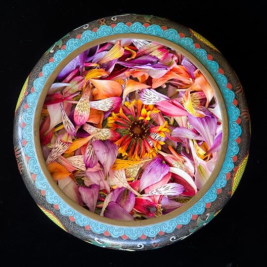 Mandala 101 © Harold DavisSince one always hurts flowers in the process of this creation, and I hate, hate, hate to hurt flowers—or anything or anyone else—I felt the least I could do was photograph “the remains of the day”: the petals in an ornate dragon-themed bowl (below).