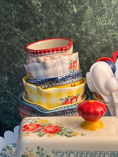 And a cute, little tower of Pioneer Woman measuring cups,a PW butter dish and a jar full of measuring spoons.I just can't resist all the colors and patterns.💛