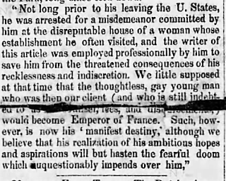 For example, the editor of the Brooklyn Daily Advertiser used the phrase in connection to Louis Napoleon in 1840. It seems the future Emperor of France had been caught at a brothel (presumably in New York City), and the Daily Advertiser used "manifest destiny" to describe Louis's fate: