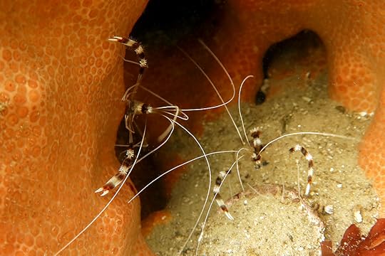 As I was beginning the last stages of the dive over on the west of the site, I came across a bowl-like orange sponge oriented horizontally. Two of the most beautiful banded shrimp were sitting in the bowl, facing out. Both looked small. Young? They were lively and seemed interested in everything. One kept doing...