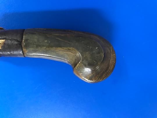 I picked this up around twenty years ago for two reasons. First, it looks cool. Two, I was considering using it as part of a cowboy outfit to do historical black powder cowboy shooting with a group known as the NCOWS. Anyhow, I got this relatively cheap (if memory serves) because it hasn’t a maker’s mark or anything else to date it accurately. It is hand forged and still retains what I assume to be an original piece of rawhide still intact. Once in hand, you can tell how well-crafted the knife is just by the way it sits in your hand. Whether you were fighting for your life or chopping through underbrush, the handle style provides an awesome grip for hacking with almost zero chance of it flying from your hand. The balance is also notable. The broad end of the blade takes what is a short weapon and turns it into a cleaver for hacking rather than a draw-cut, a sort of hybrid between ax and knife while retaining the ability to stab. There is no evidence of a maker and so no way to know where it was made, but folks I’ve spoken to suggest it is civil war era, possibly southern… but! No way to know.