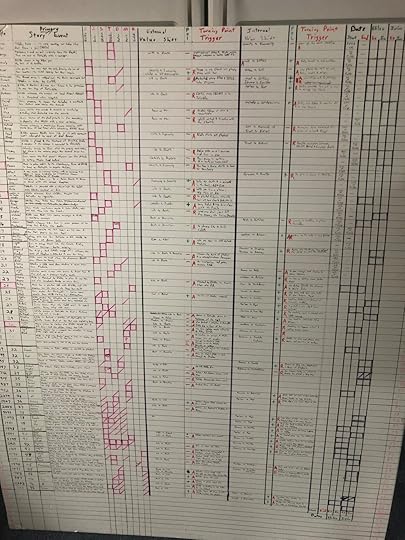 I came across this artifact of Eve of Snows and thought it. might be fun to give folks a different perspective of the novel. The immediate response a friend of mine had is one many people will probably share: Dear God! That’s how you planned out the book? Ummm, no. Eve of Snows was either published or close to it at this point, I don’t recall, but the point of this project was to reverse engineer the story, so to speak, by how each scene/chapter altered the standing of the characters and the overall story.