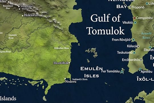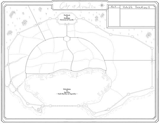 A rough draft of the City of Aprelêu as imagined by cartographer Kate Moody, who will be working on my city maps from now on, or until she gets sick of me. The map will be at a level of detail appropriate for print, meaning focused on a district-level view rather than detailing individual buildings. The city is located in the deep south of the Gorotan Penninsula (seen on the eastern portion of the second map posted here) and will be a major story hub for the Contessa of Mostul Ûbar and in both Sundering the Crowns and Sundering the Tempest. Eventually, this will have several layers, including the undercity.