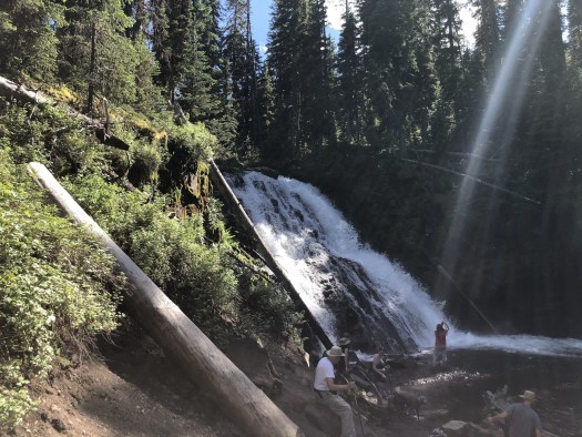At Grotto Falls, the first of eleven waterfalls along this trail, six or seven people loitered near the churning water, taking turns rotating through the most advantageous spot for snapshots. We hung back and sat on a bench wrought from a colossal pine slab, probably with a chainsaw. We chatted playfully, though mostly we enjoyed the silence and the sound of the roaring waterfall.